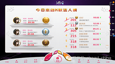 “小清新”点歌界面,有更多完善的功能,比如“缺歌提交”“评分排行” “K歌达人排行榜”等功能,更适用于多种语言。 心动不如行动,大家赶紧来体验吧!